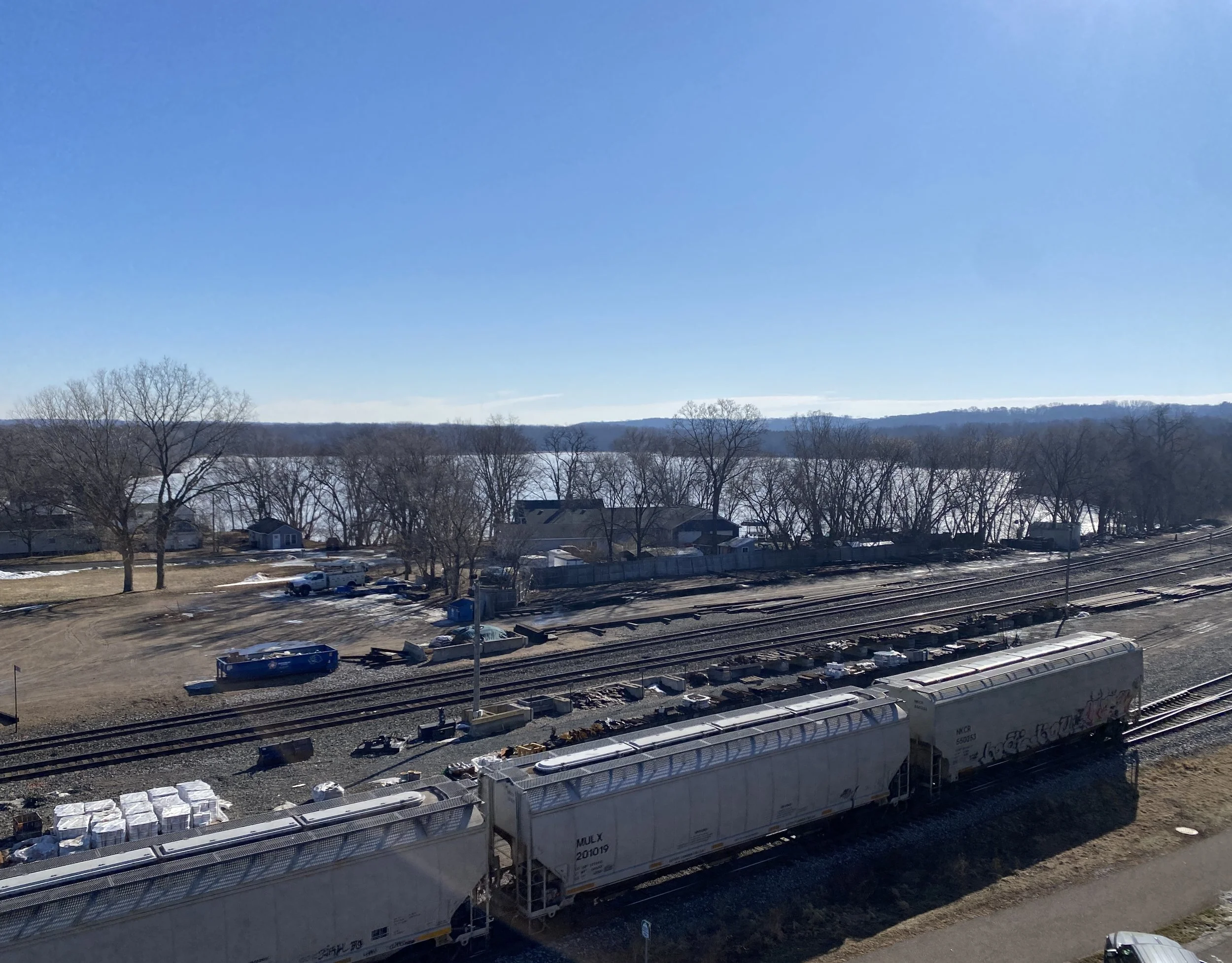 The picture below, taken from a different vantage point than Gracie and I had the other day, intrigues me and brings comfort. Various rails, sometimes busy and sometimes quiet. A peaceful lake in the background reminding me that the pace of nature is always a wise one. Blue sky, wide open and full of possibility.